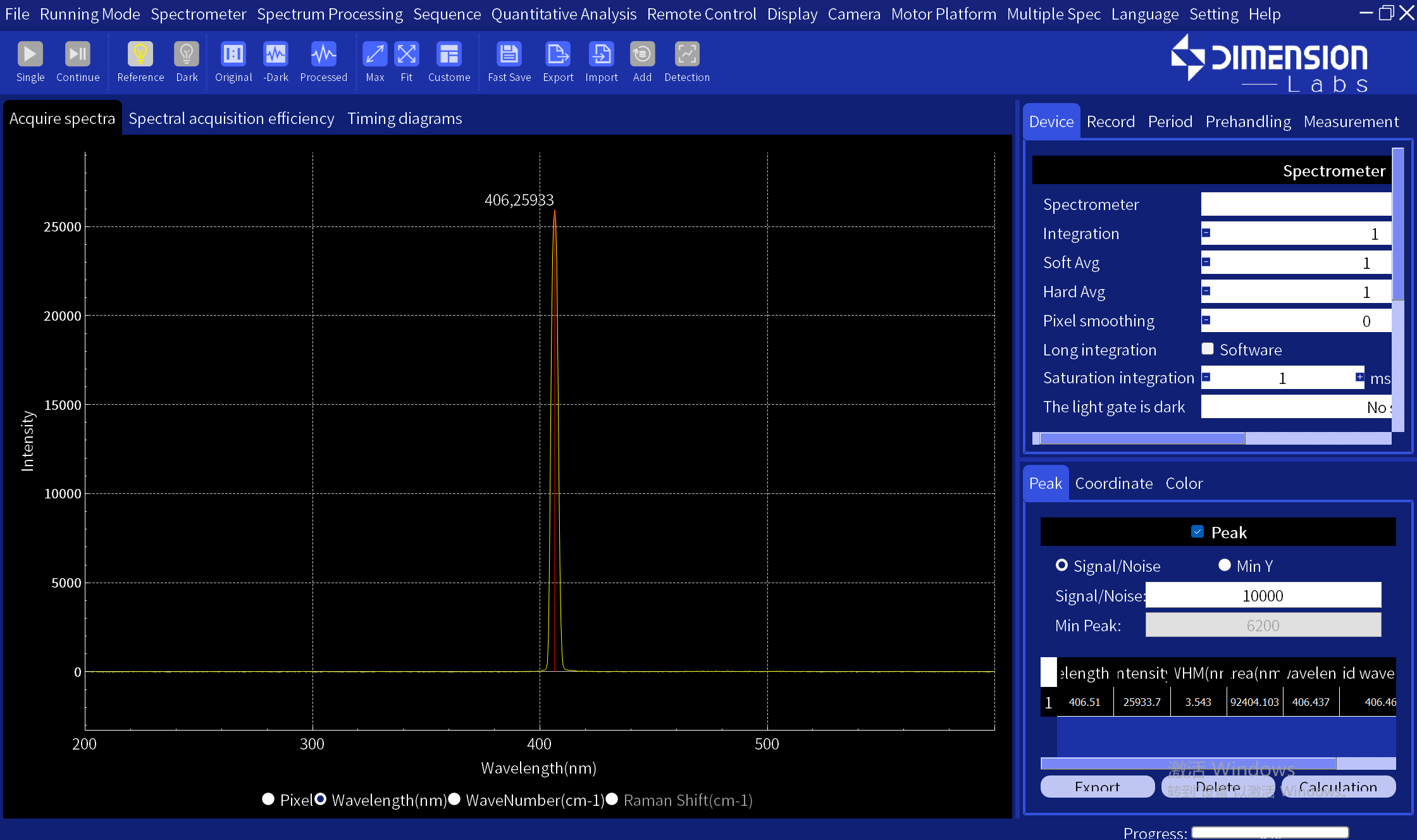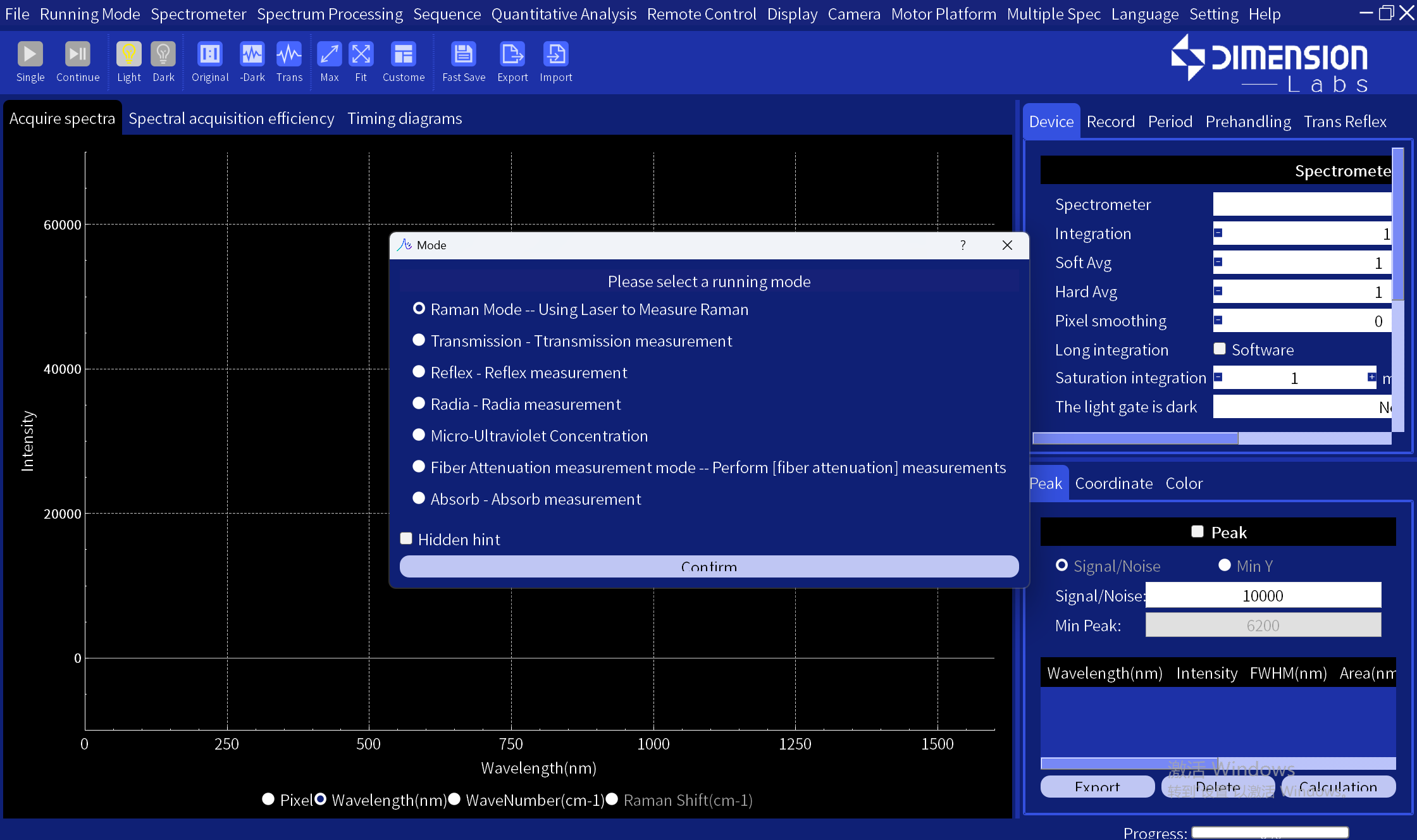 • Horizontal Axis Display Modes: Pixel, Wavelength, Wavenumber, Raman Shift