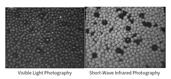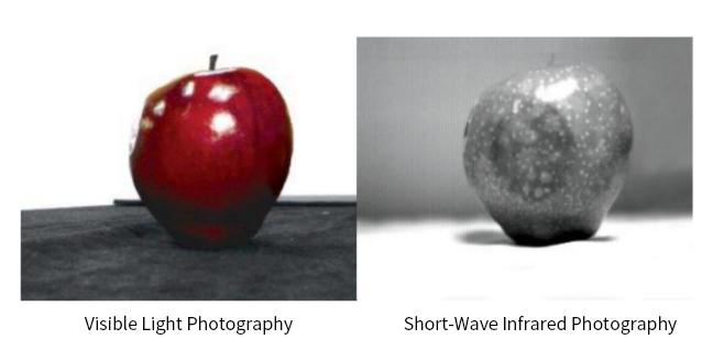 Water has the property of absorbing light with a wavelength around 1450nm. Since bruised areas have a relatively high water content and appear black in color, this wavelength can be used to photograph fruits for screening and classification.