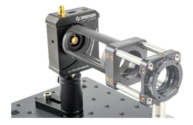 Dimension-Labs offers a series of indium gallium arsenide (InGaAs) amplified photodetectors with the following features: ● Selectable Wavelength Ranges: 850–1650 nm, 1100–1650 nm, 1200–1650 nm, 1480–1650 nm ● Low-Noise Amplifier: Fixed or adjustable gain ● Load Impedance: 50 Ω or higher ● Inputs: Free-space optical input and fiber-coupled input Standard accessories include an SMA-BNC RF cable.