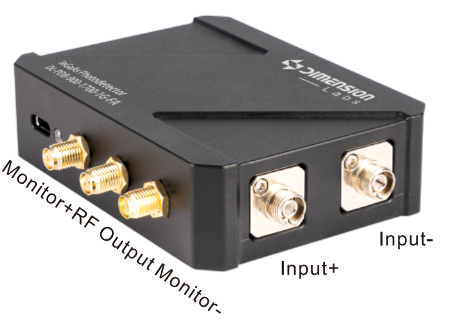 Dimension-Labs presents both fiber-optic input models and versatile models supporting seamless switching between free-space and fiber-optic inputs, tailored to diverse application scenarios. The fiber-optic balanced detectors feature two fiber input ports (Input+ and Input-), enabling direct connection to various fiber interfaces such as PC/APC for transmitting optical signals. Three SMA outputs provide common-mode signals and two monitor channels (MONITOR+ and MONITOR-) for real-time signal monitoring